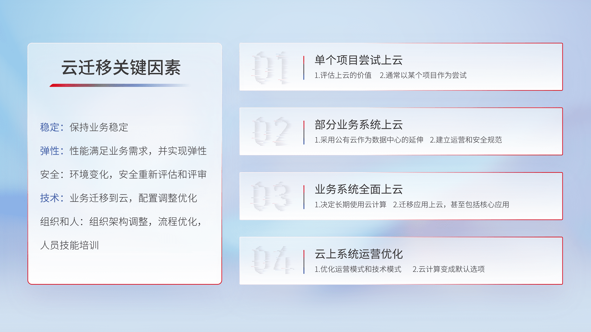 结合实际业务,,,,从规划设计、、、、云平台选型、、、云原生改造、、数据迁移、、、集成交付,,,,迁移全过程为客户识别最佳上云路径,,做好风险识别管理,,,设计网络架构、、、身份权限、、安全审计合规、、操作审计、、、、日志审计、、、监控告警策略、、多站点容灾设计等,,对云上基础设施进行整体规划,,,,提升IT治理水平,,,以满足弹性、、高可用、、、、高性能的需求。。