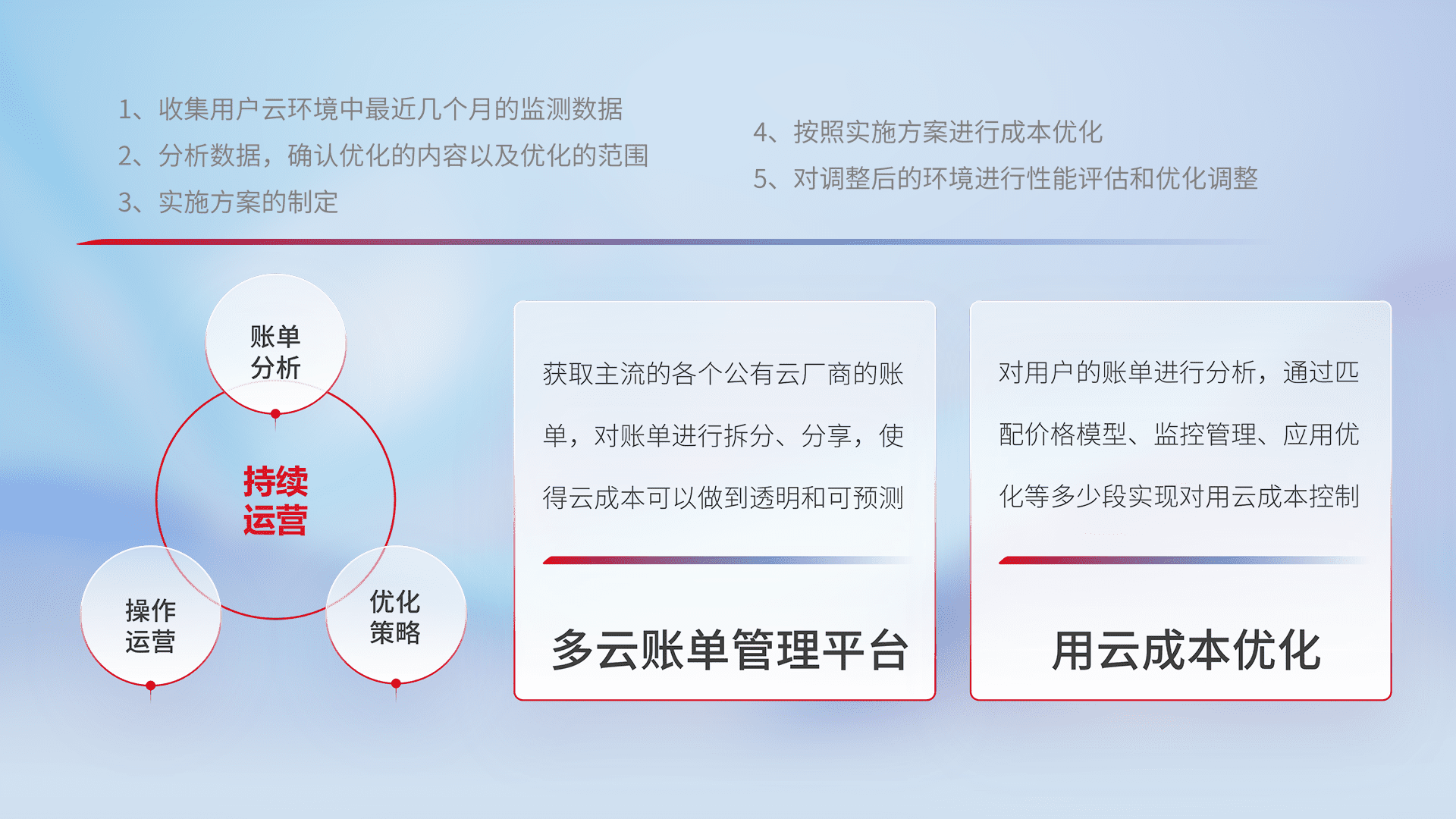通过多云纳管,,以统一的资源数据模型把客户的云资源进行抽象和封装,,进而实现对多云资源的统一操作,,,保障云资源管理的可靠性、、、稳定性与可用性。。。。量身定制化运维内容,,,,配置、、、开发运维、、、补丁管理、、备份、、、、监控、、、认证和访问管理、、审计和日常巡检等,,,保障在用云过程中的可靠度,,稳定度以及高可用率。。
