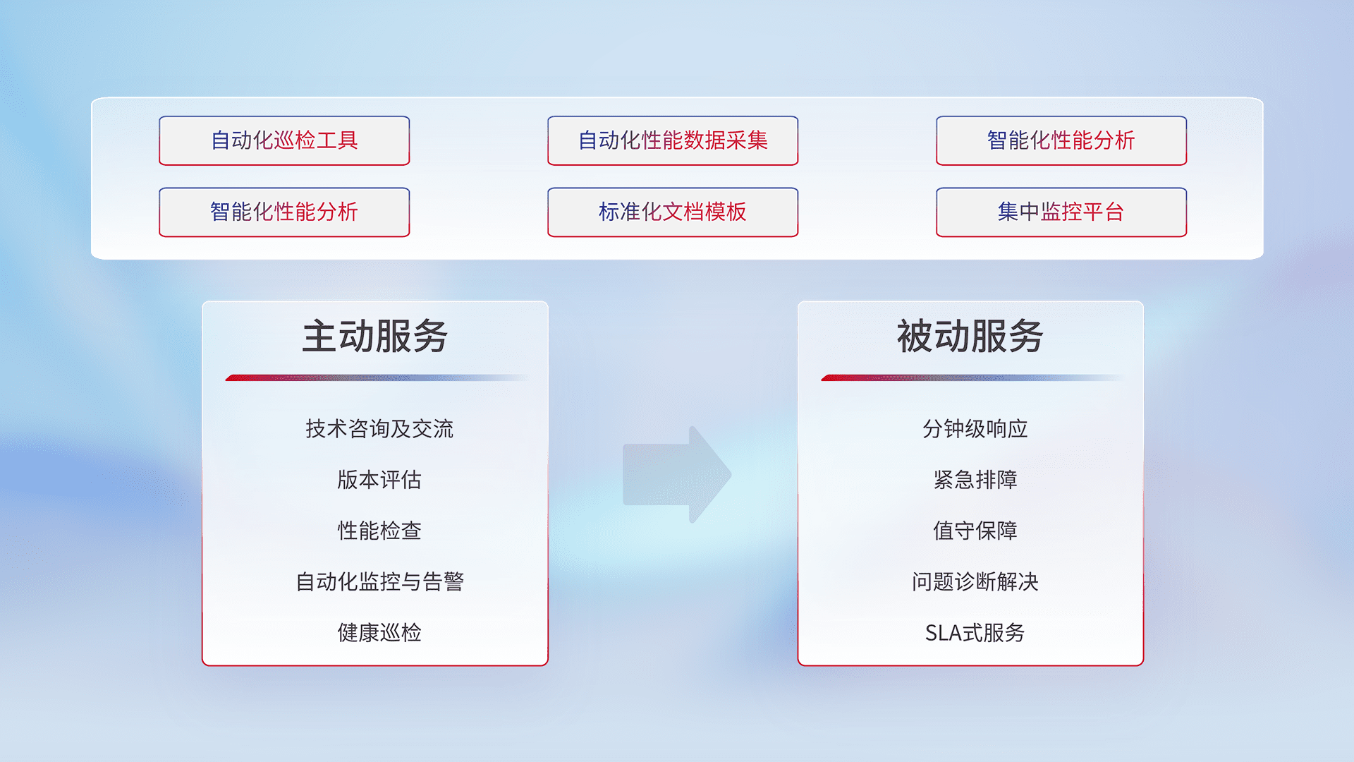智能化工具和标准化文档,,,保障服务质量,,,,提供主动服务(包含技术咨询、、、版本评估、、性能检查、、、、自动化监控与告警、、健康巡检)和被动服务包含(分钟级响应、、紧急排障、、、值守保障、、、问题诊断解决、、SLA服务)。。。