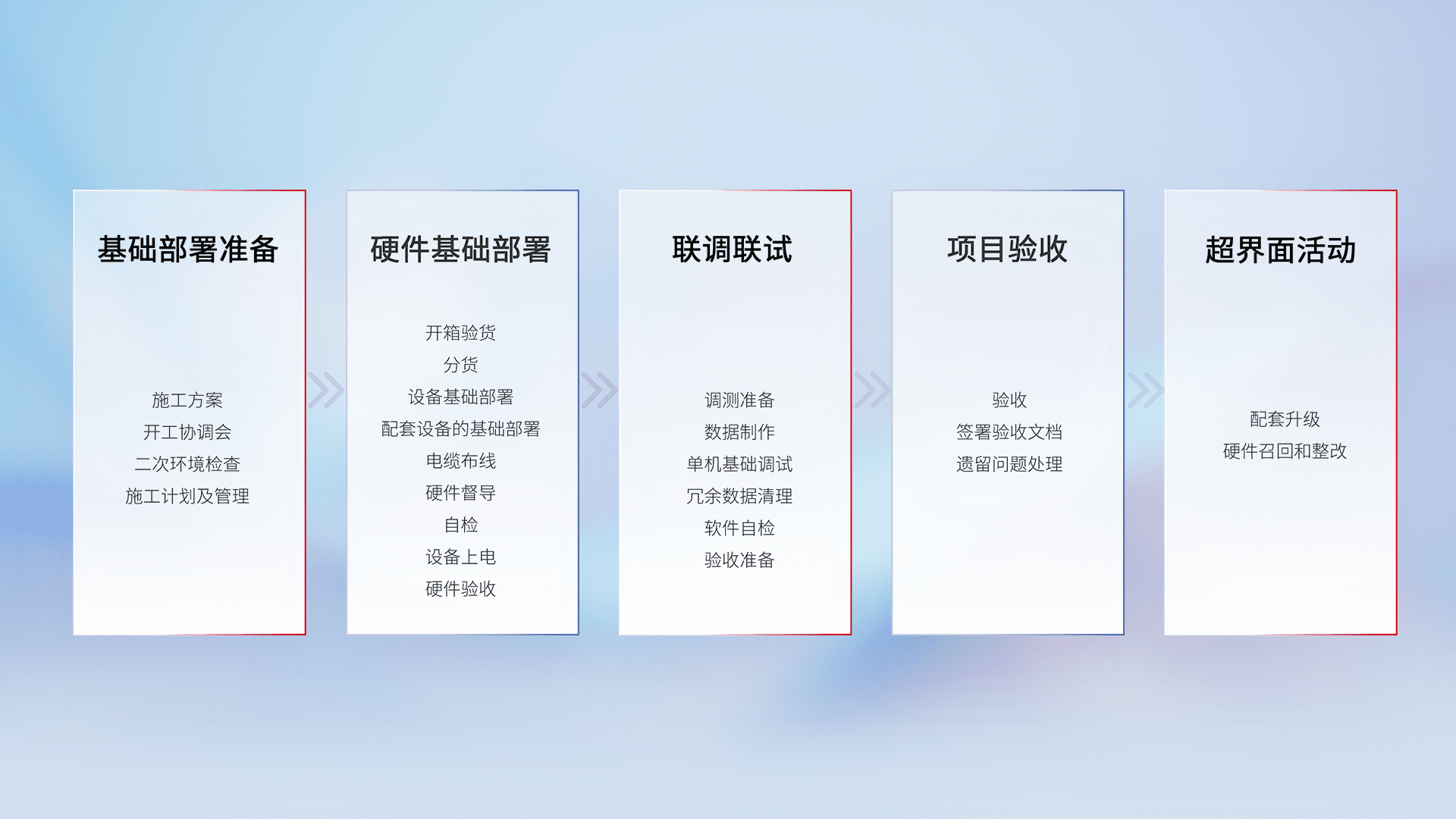 从基础部署准备、、、、硬件基础部署、、、联调联试、、、项目验收、、、越界面活动的全过程可追溯,,保证施工质量和进度。。。。
